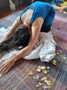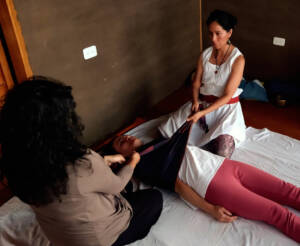 Es un rito de paso donde utilizo la terapia craneosacral, el baño con plantas medicinales, infusiones herbales, música y el cierre del cuerpo con rebozo para integrar los cambios físicos, emocionales y espirituales que implican nacer mamá.